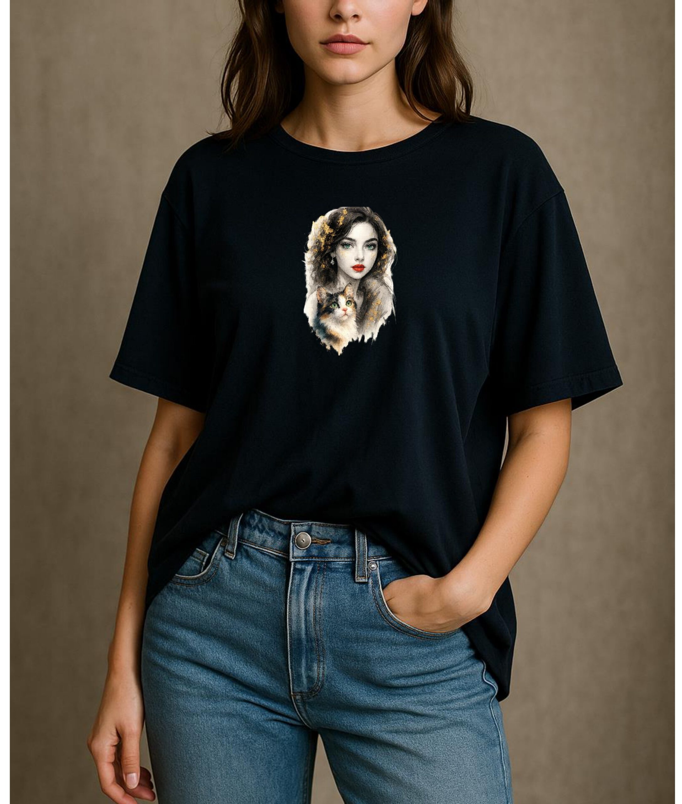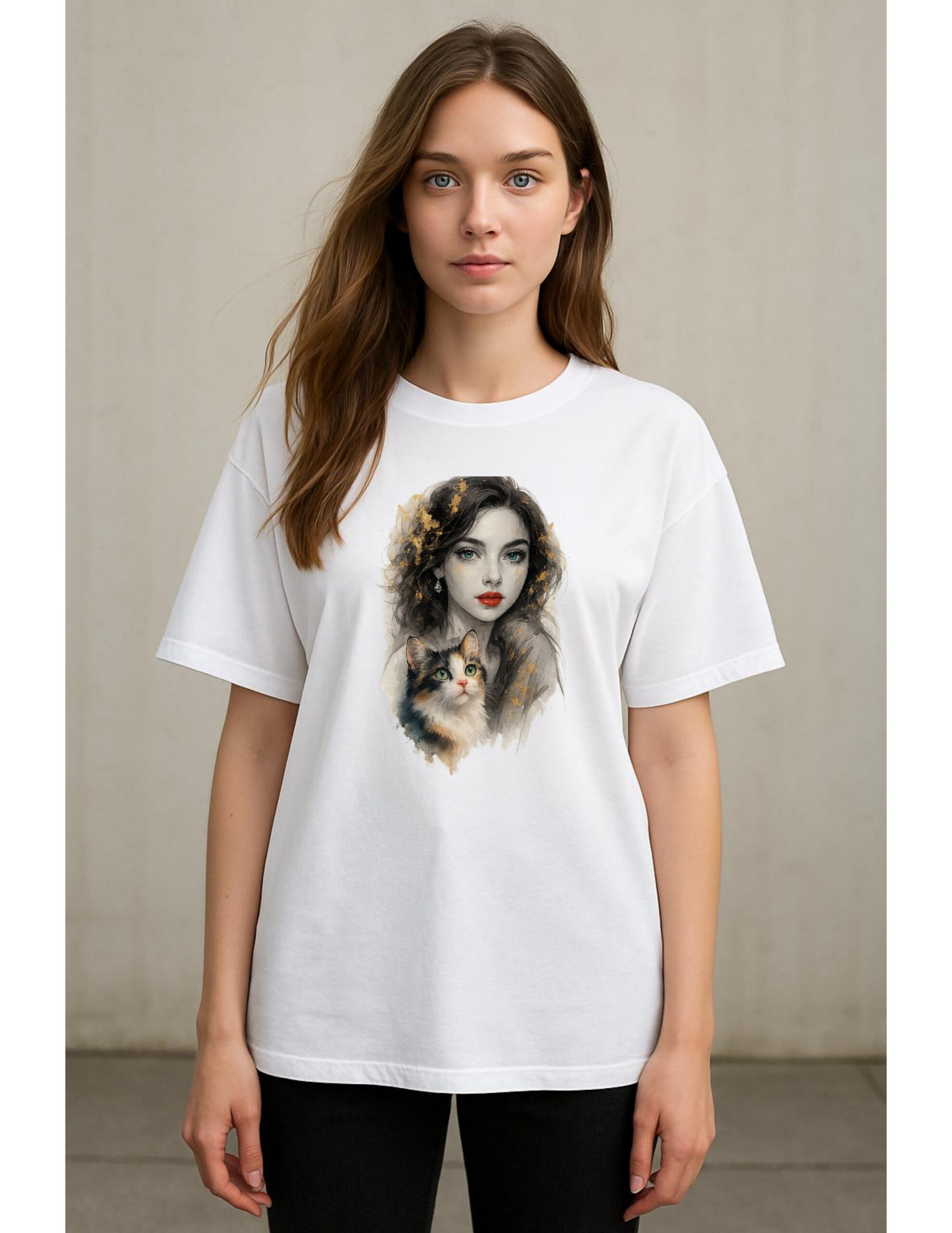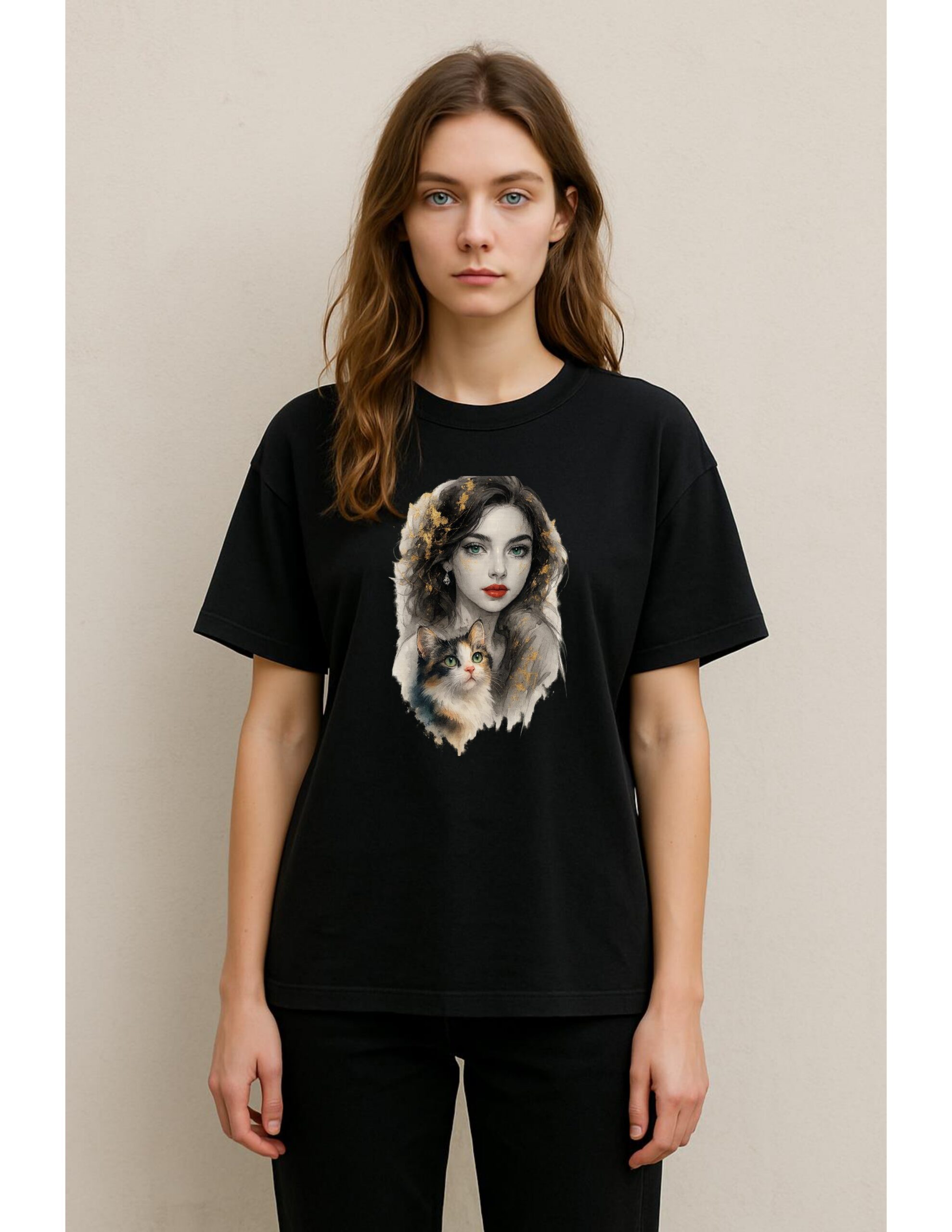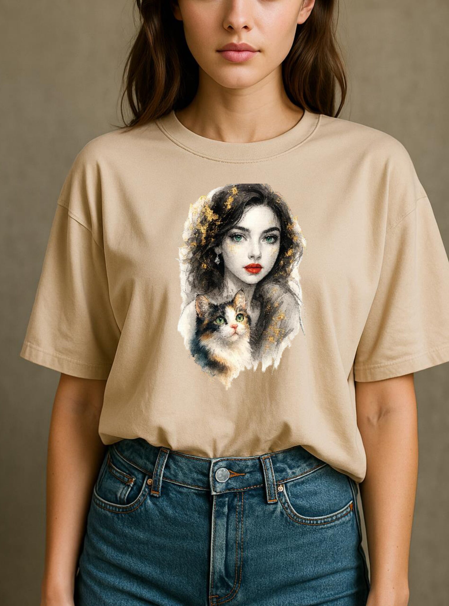 Elevate your style with Drop Shoulder shirt “Golden Gaze”, a captivating shirt design blending ethereal beauty with feline elegance. This artwork features a stunning woman with emerald eyes and bold red lips, diamond earrings, complemented by a charming calico cat—both adorned with shimmering gold accents. The painterly style merges classical portraiture with modern fantasy, creating a timeless visual that speaks of mystery, grace, and companionship.